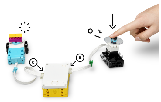力センサーモジュールをポートB、LモーターモジュールをポートCに接続した状態で、プログラムの実行フロー(プログラムの流れ)を変更する方法を見てみましょう。